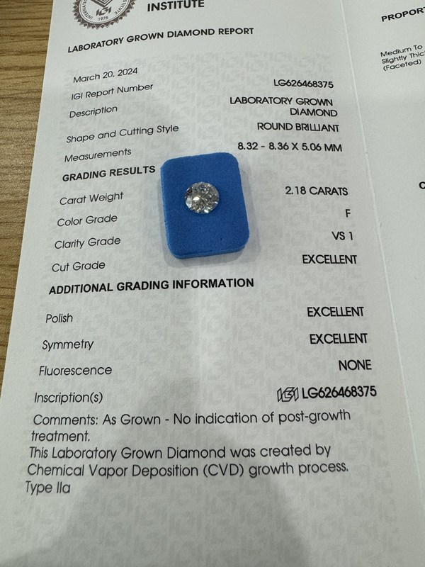 2.18CT F VS1 3EX CVD Lab Tumbuh Berlian Potong Bulat Sertifikat IGI